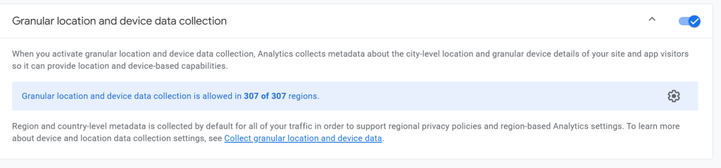This functionality is similar to the «Granular location and device data collection» setting found in the Google Analytics UI under Admin > Data Collection.