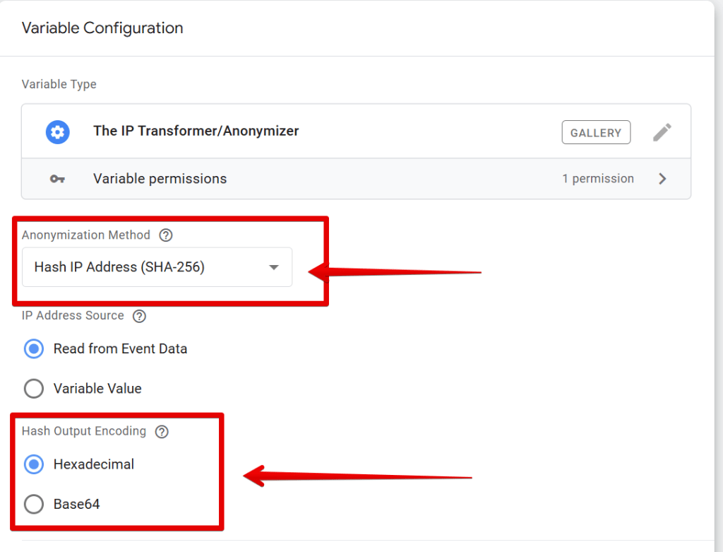The «IP Transformer/Anonymizer» variable allows you to hash IP addresses by selecting the «Hashing» option.