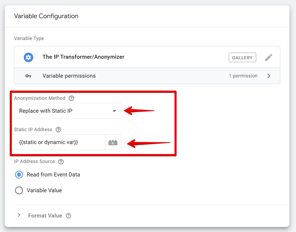 However, if you’re working with other data sources, select the «Variable Value» option and enter the variable that contains the IP address, as shown in the image below.