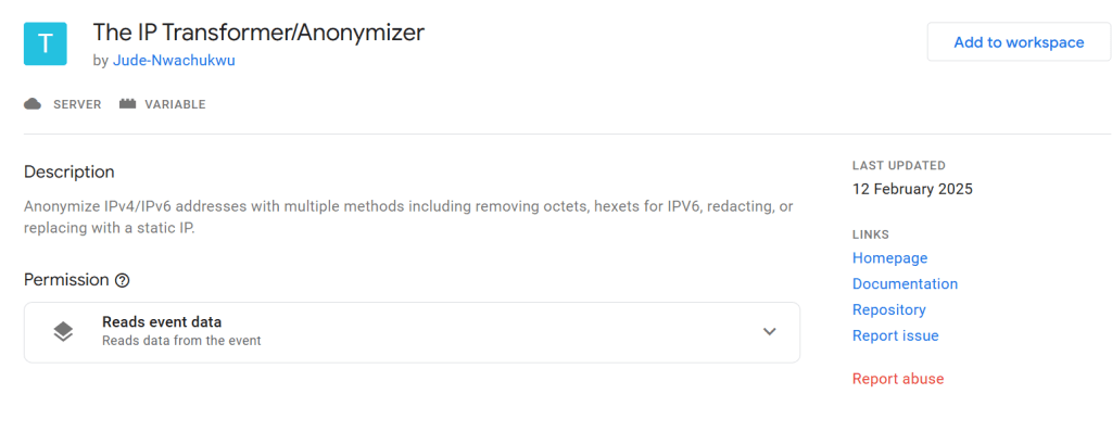 While the anonymization method made available by the variable template is useful, it is limited to removing only the last octet. If you need greater flexibility, you can use the DumbData «IP Transformer/Anonymizer» custom template variable, which can also be added from the GTM Template Gallery.